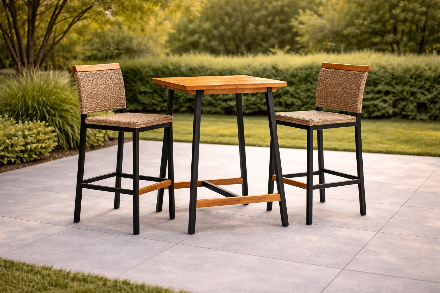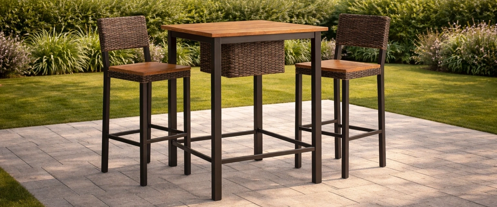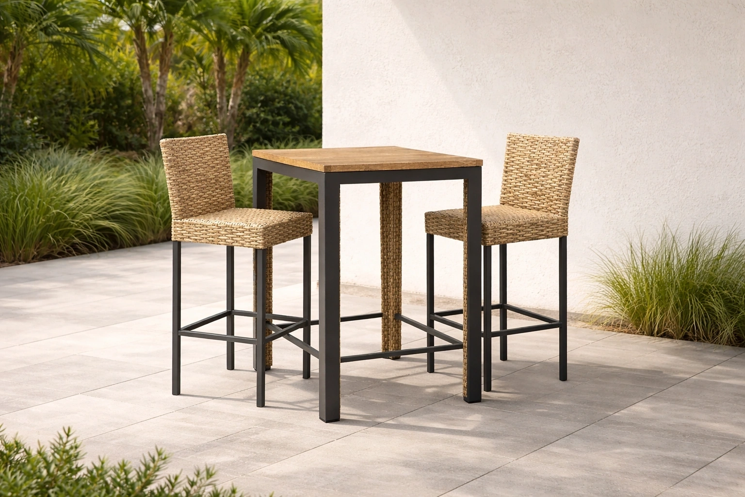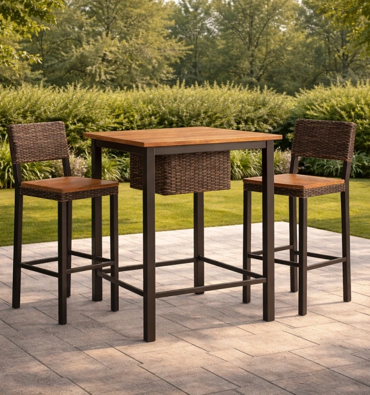 Ensemble de bar en bois et métal avec chaises en rotin tressé