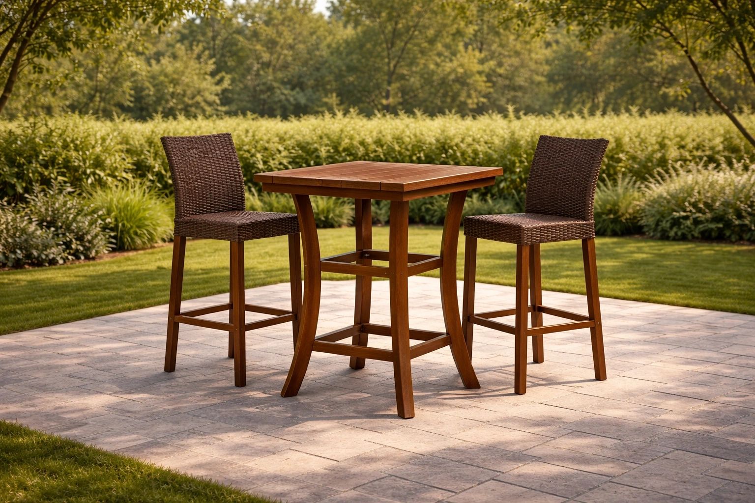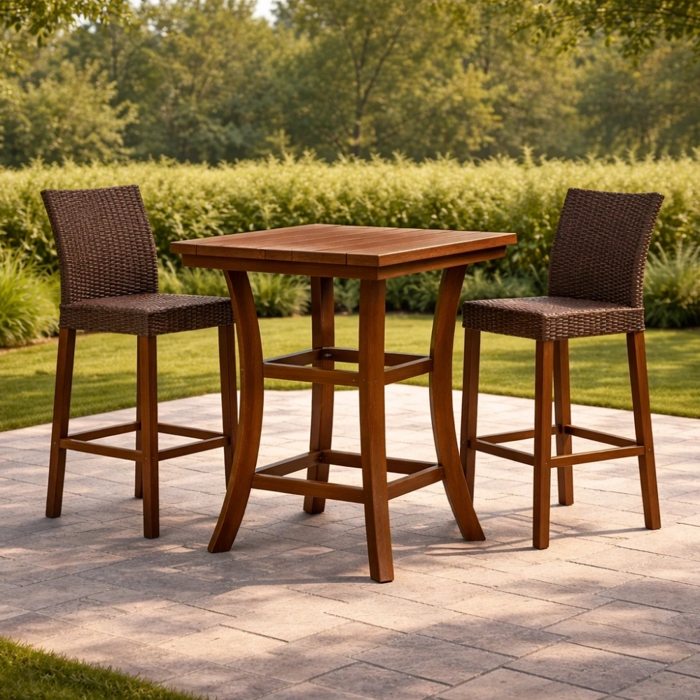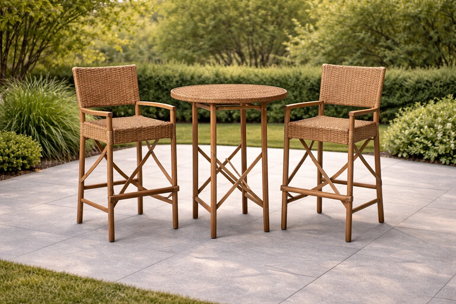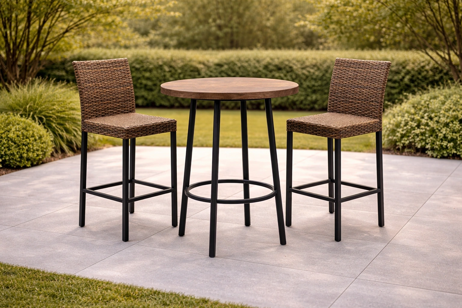 Ensemble de bar en bois et métal avec chaises en rotin tressé