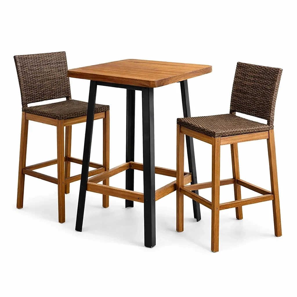 Matériaux : Plateau de table en teck, pieds en acier enduit ; Structure de chaise en teck, assise et dossier en rotin synthétique