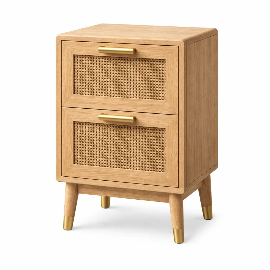 Cette table de nuit est fabriquée en chêne massif avec des façades de tiroirs en rotin tissé. Elle offre une esthétique naturelle et fonctionnelle.